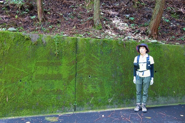 山の北側になる薄暗い道の脇のコンクリートの擁壁には苔がびっしりと付いている。