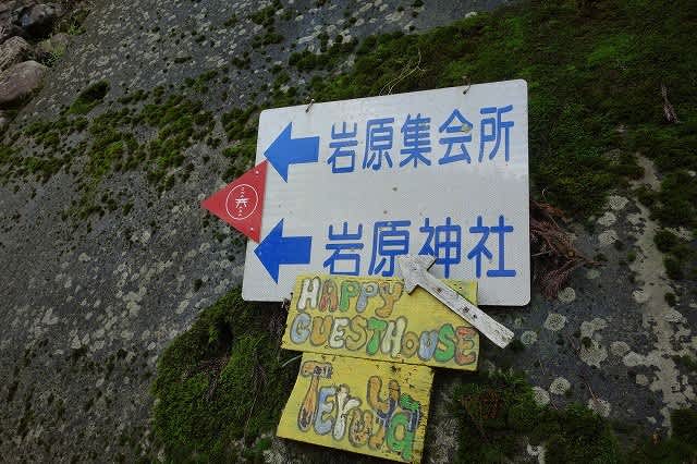 直ぐに道は二手に分かれていて脇にある岩原神社と書かれたプレートには、