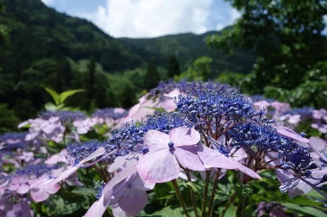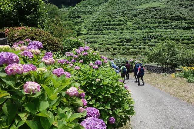 校舎跡からしばらくは集落の中の車道を進んで行く。道には色とりどりのあじさいが咲いて