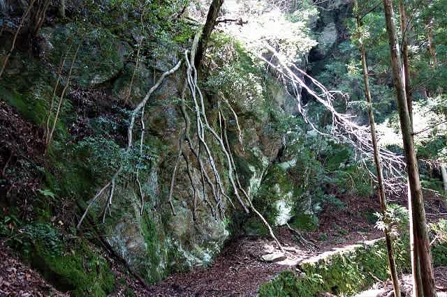 山側には高い岩壁が続き、所々で巨岩が道まで迫っている。