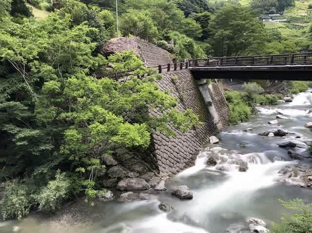 橋を渡り少し歩くと赤根川に自然の岩盤をくり抜いた突堤があった。