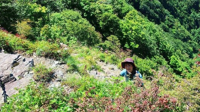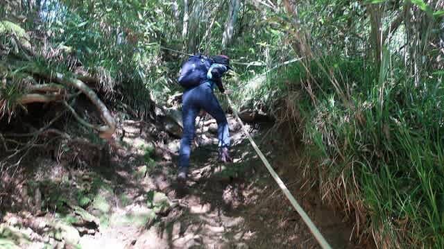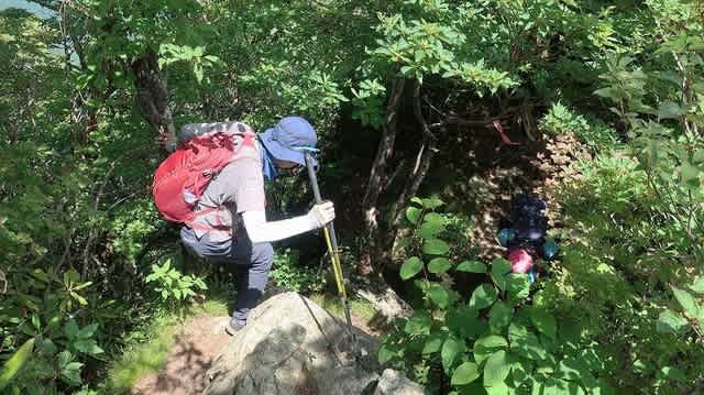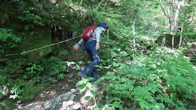 岩場のロープも先週と同じようにして下って行くあっちゃん。下りきったのを見定めて