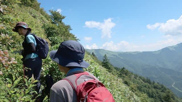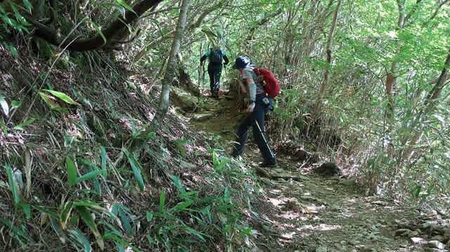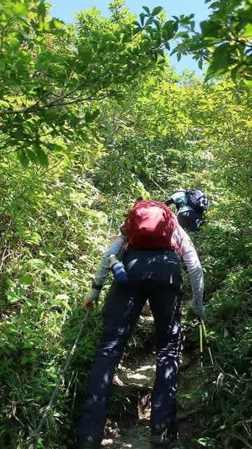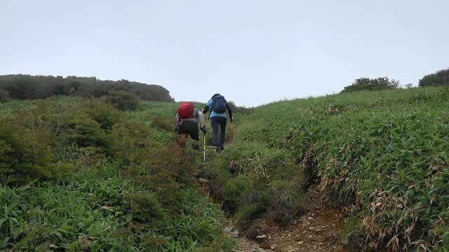 トラバースの樹林帯が終わると、また笹原道になる。『まだまだ遠いわね~』と奥様二人。