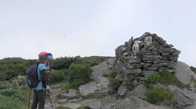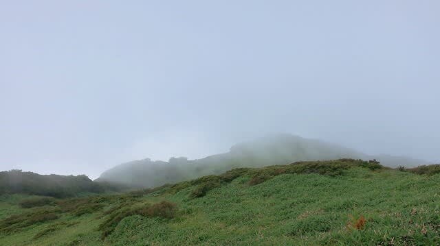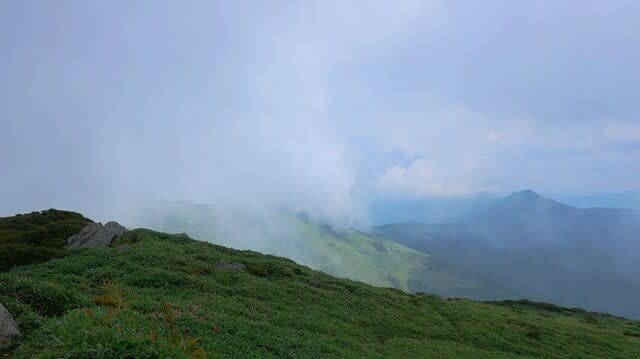 山頂が近づくにつれ稜線の北側からガスが流れ始めた。いつもなら景色が見られなくなる!
