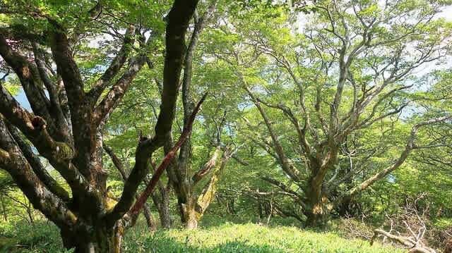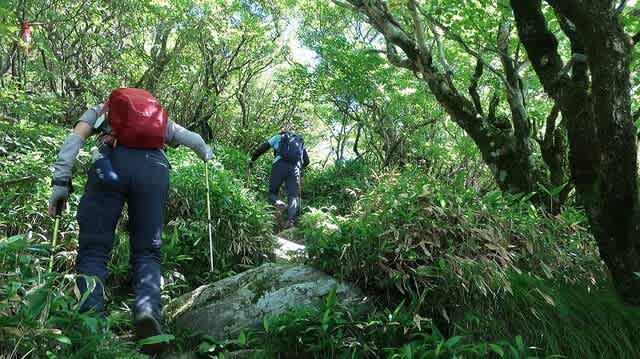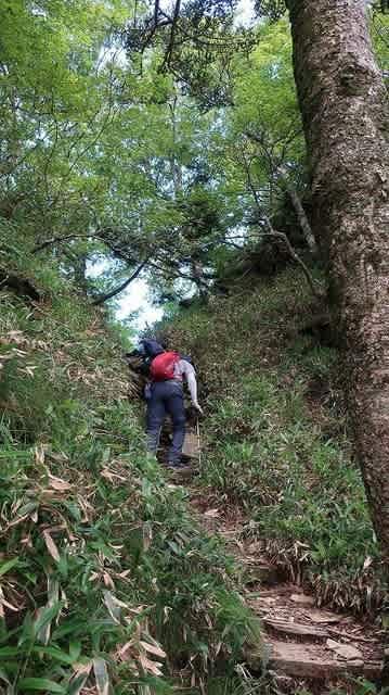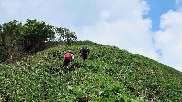 梯子のある鞍部からしばらく樹林帯の中を登って行くと、山頂近くの笹原になる。