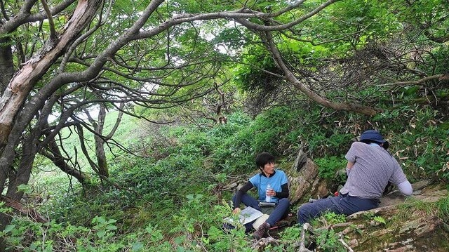 丸山荘への分岐の手前で、『山頂は日が当たるから、この日陰でお昼にしませんか?』と