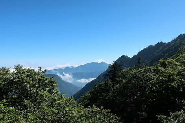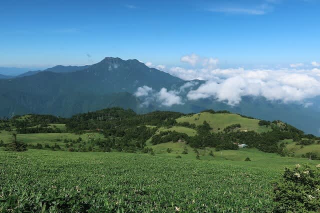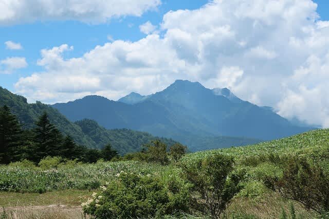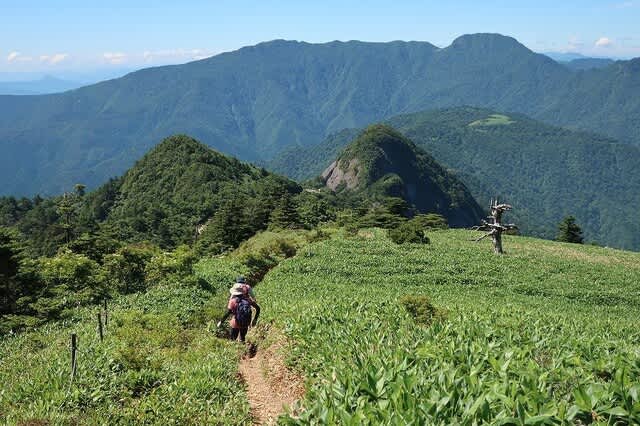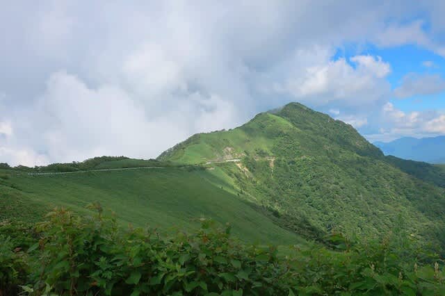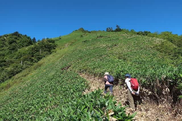 夏真っ盛り、笹の勢いが一番ある時期だが、登山道はその笹が綺麗に刈り払われている。