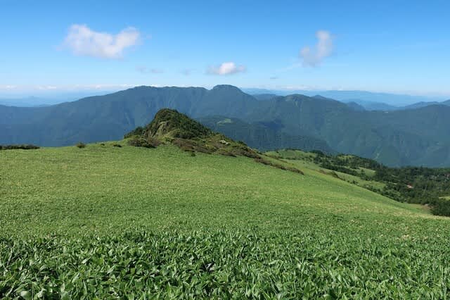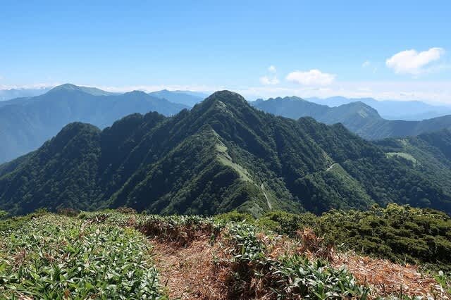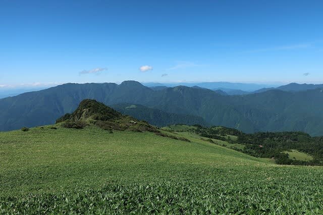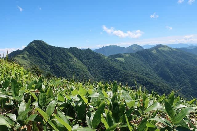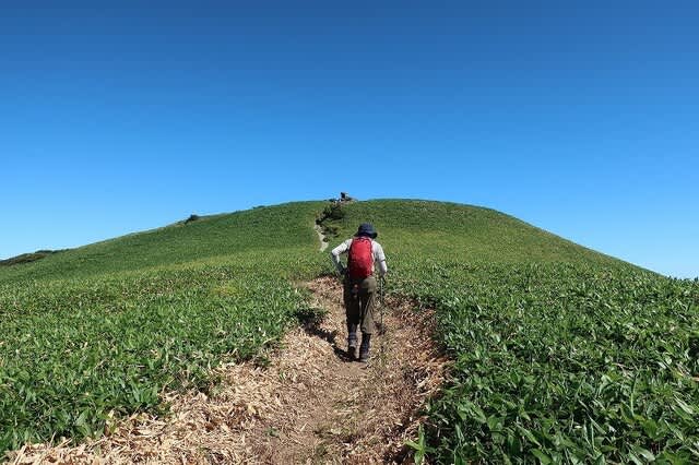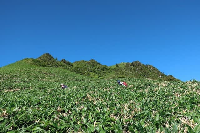 樹林帯を抜けると緩やかに広がる笹原尾根が目の前に広がって来た。