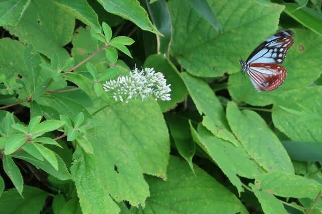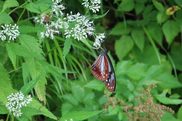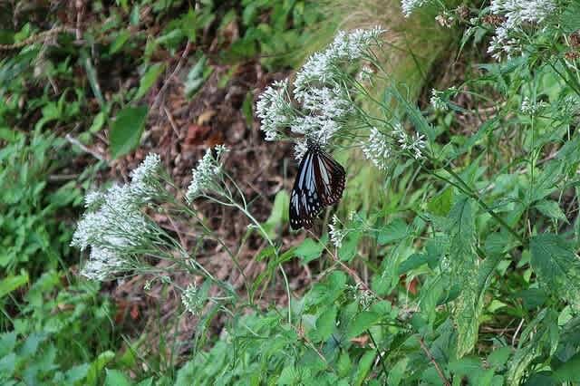 単調な林道歩きに思わぬ出来事が。道の脇に咲くヒヨドリバナに飛来する沢山のアサギマダラ。