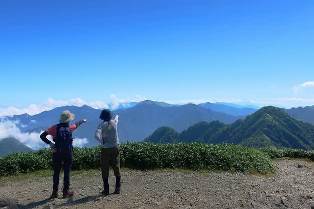 東の稜線を眺めながら、今回線で繋いできた山々を同定している奥様たち。
