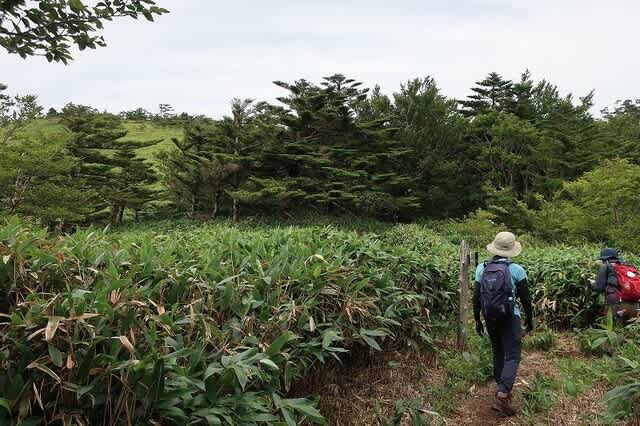 最初は樹林帯の中の道で歩きやすかったが、樹林帯を抜けると笹道になる。