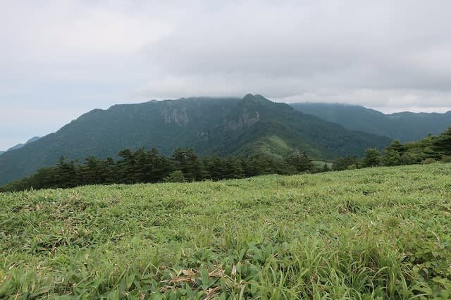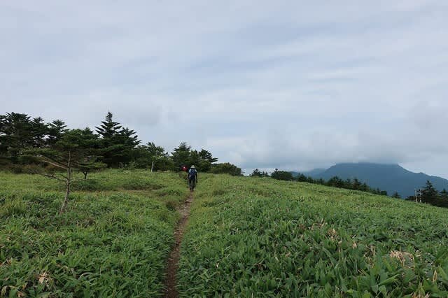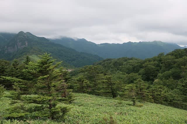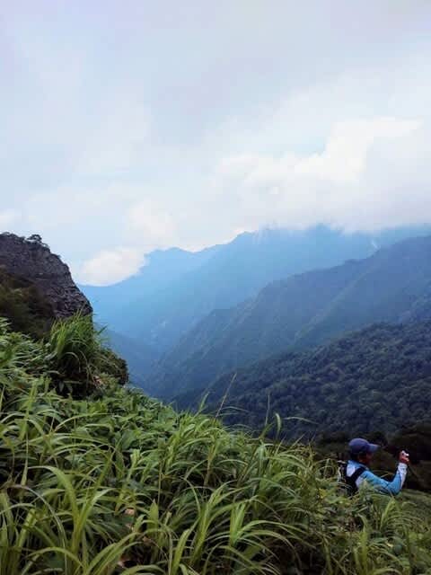 進歩した前の二人は苦も無く歩いて行く。正面には頭が雲に隠れた石鎚山が見える。