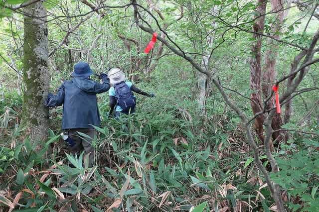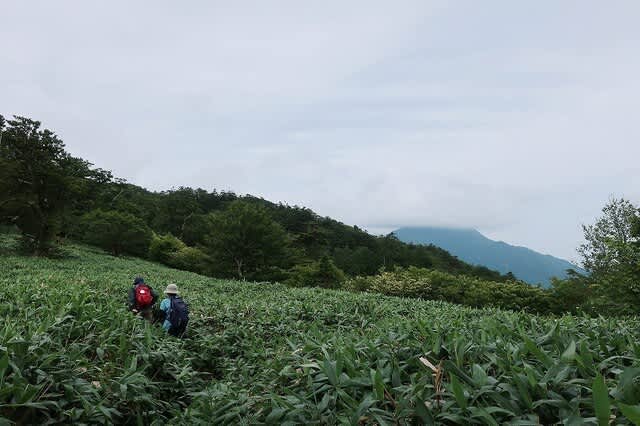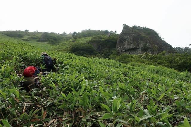 レポートで見た岩壁が右手に見えると、見上げるほどの角度で広い笹の斜面が続いていた。