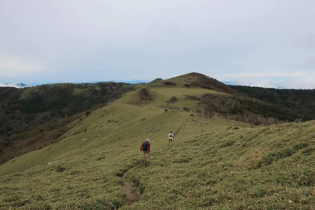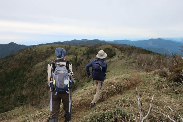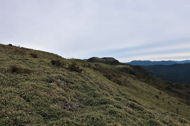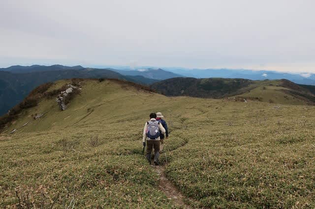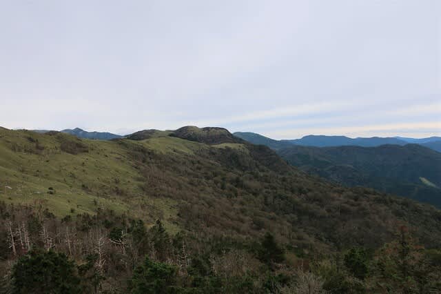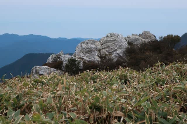 笹原から分岐に出ると今度は東側の眺望が広がっていた。広大な笹原と稜線の奥に土佐矢筈山が見える。