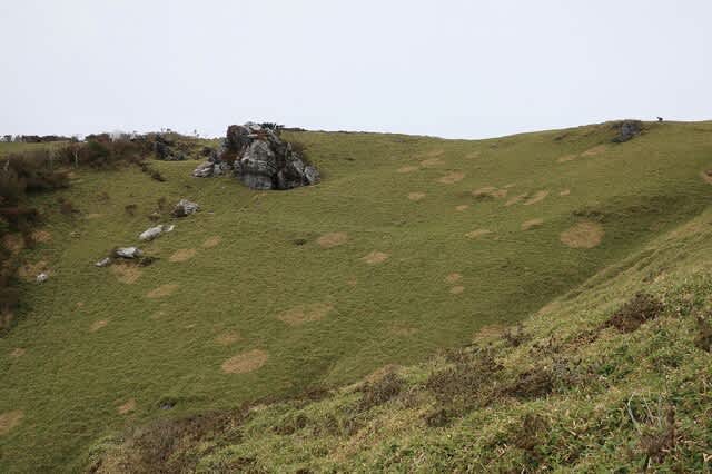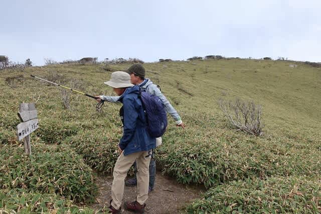 山頂の東側から西側に回り込むと分岐から広がる笹の斜面に不思議な模様が見える。