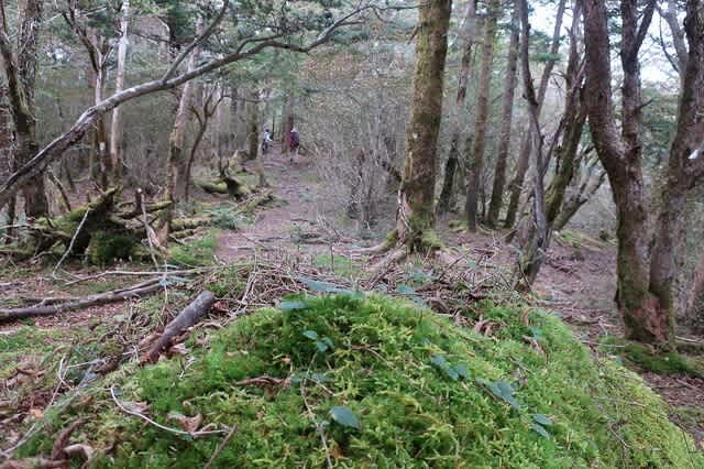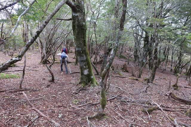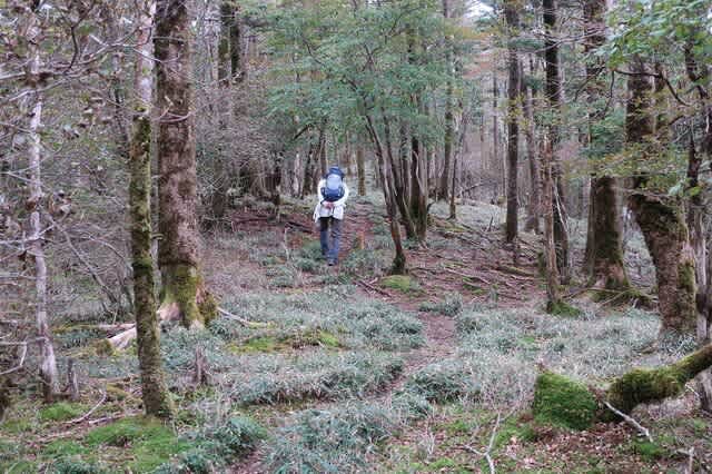 足元が背の低い笹の急坂を下って行くと、比較的緩やかな樹林帯の道になる。