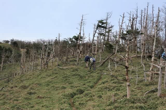 稜線上に白骨林が点在する道。ただ一旦下って登り返すと直ぐに小桧曽山に着いた。