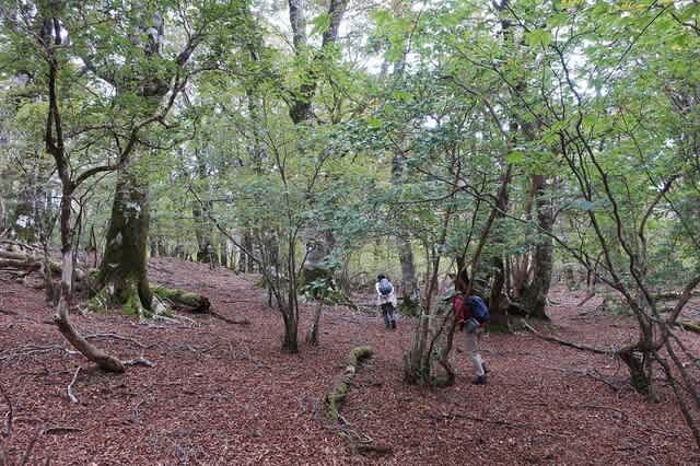 林床は落ち葉で赤く染まっているが、ブナの黄葉や他の木々の紅葉もまだのような感じがした。
