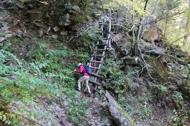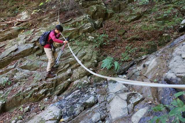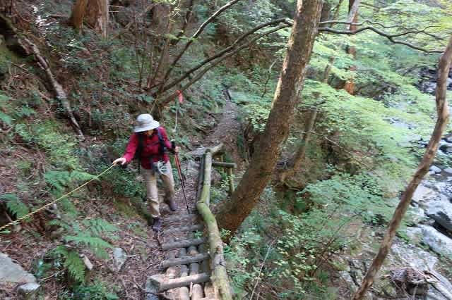 山側から水が流れる岩場を渡って行く。そして段差のある場所には梯子と、