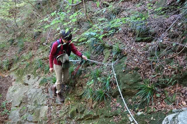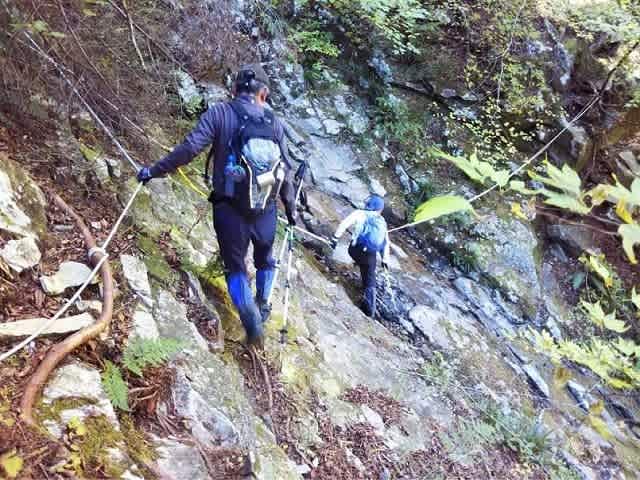 高巻の道にも何ヵ所か岩肌を渡る場所がある。事前にYAMAPで学習してきた奥様たち。