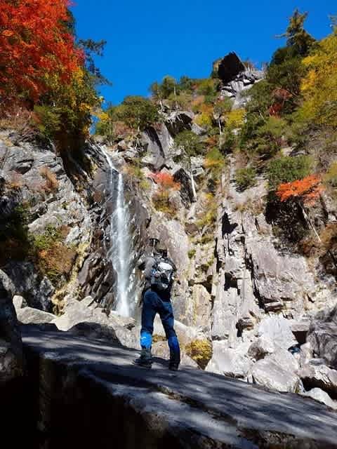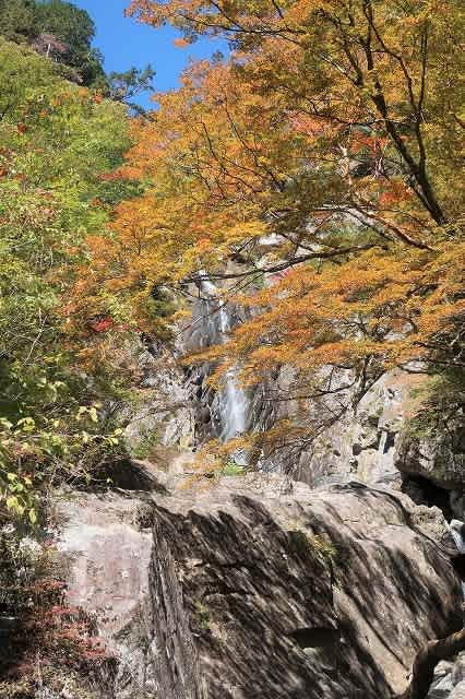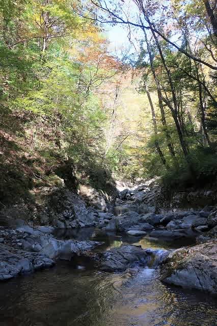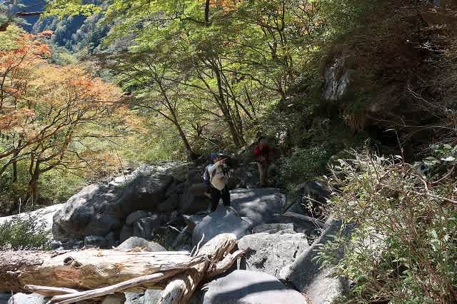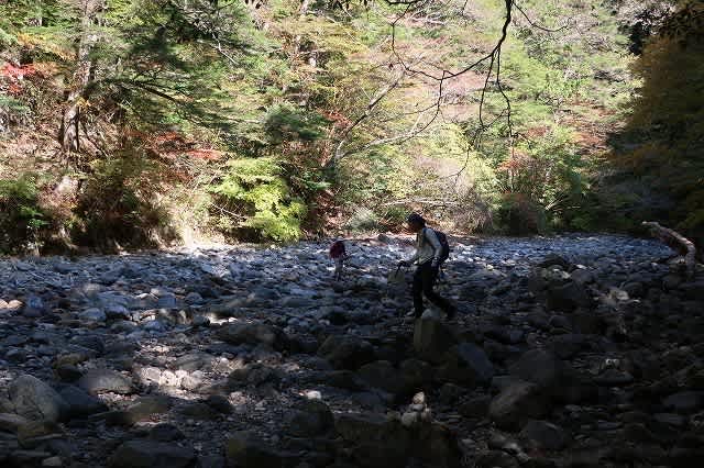 少し木々の茂った右岸を登り、一旦沢に降りると目の前に色づいた木々の間から