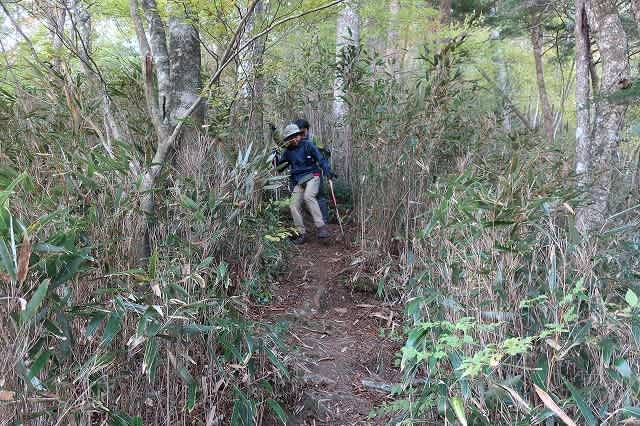 弥山から西ノ冠岳に続く稜線の下に、笹原に続いている道が見えた。