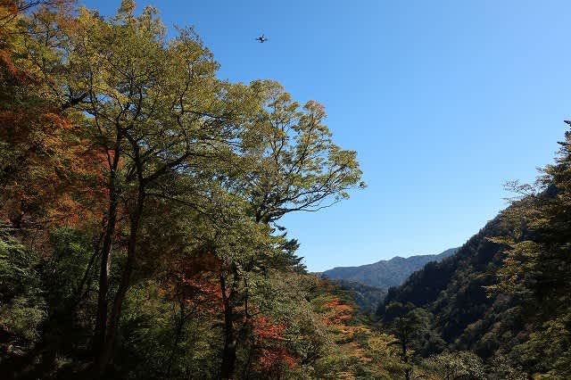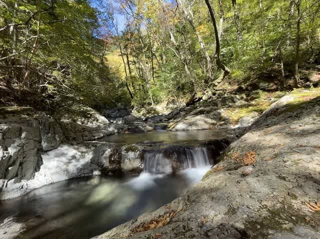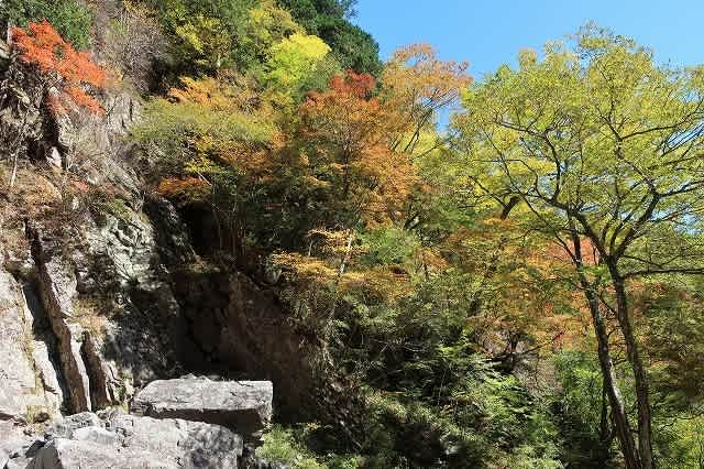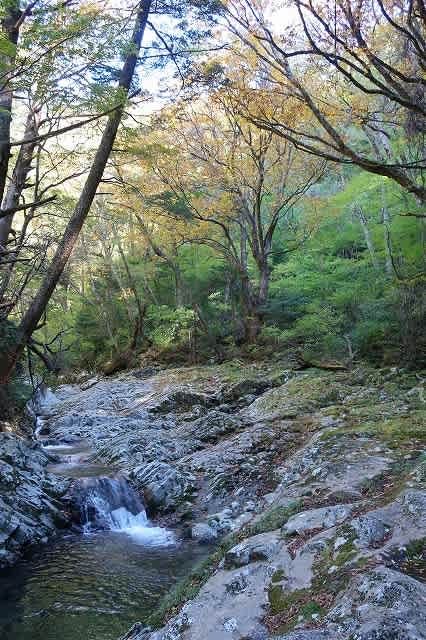 振り返ると南に向かって渓谷が続いている。沢の両側の木々の色付きはあと少しだが、