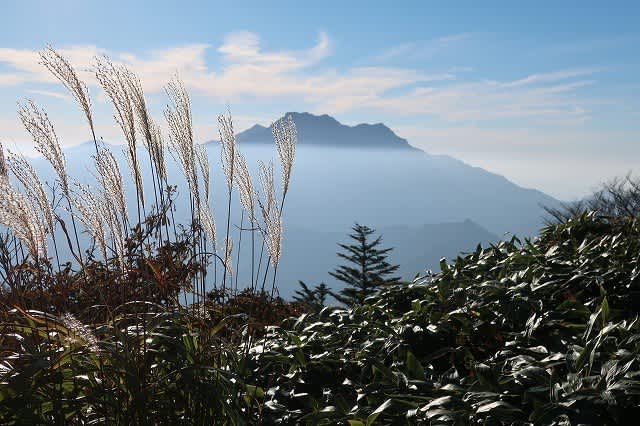 水平のラインに浮かぶ石鎚山。そしてコメツツジの色付いた東黒森山。途中で何度も車の