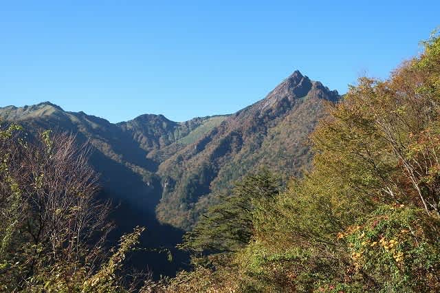 林道から見る石鎚山は雲一つない。益々期待感が膨らんで行く。