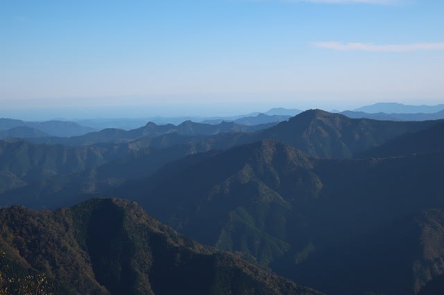 澄んだ空気の中、南を見ると朝の柔らかい陽に包まれ山々が墨絵のように続き、