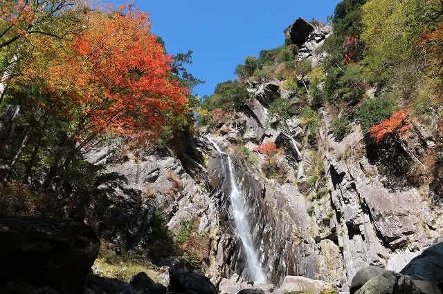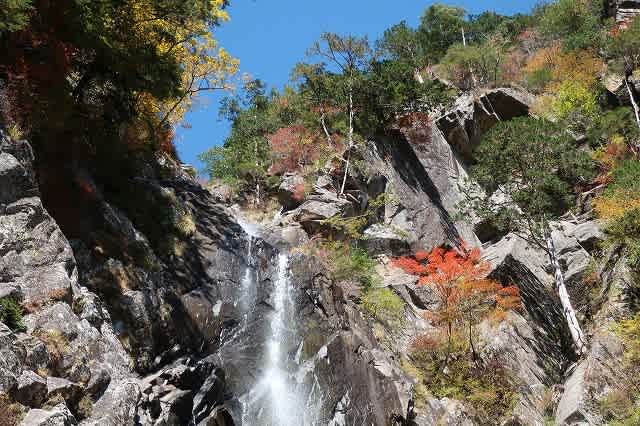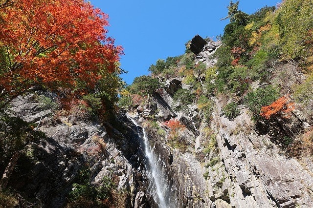 その両側には色付いた木々と南に開けた滝は明るく、青空から流れ落ちているように見える。