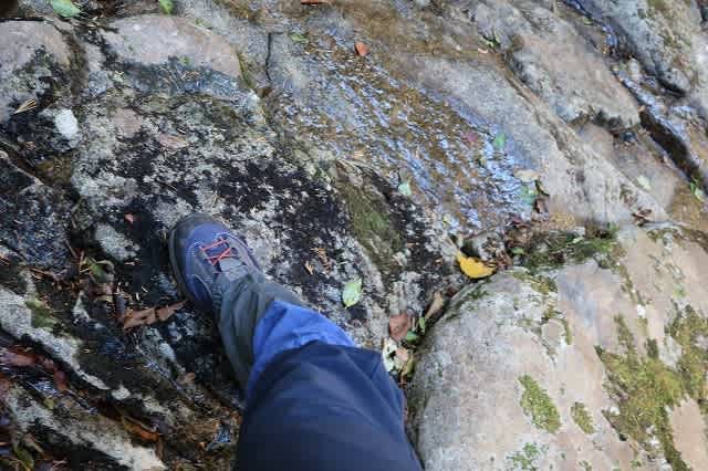 広い白い岩肌に薄く苔が付き、その岩には小さな段差に小滝ができ、このルートの