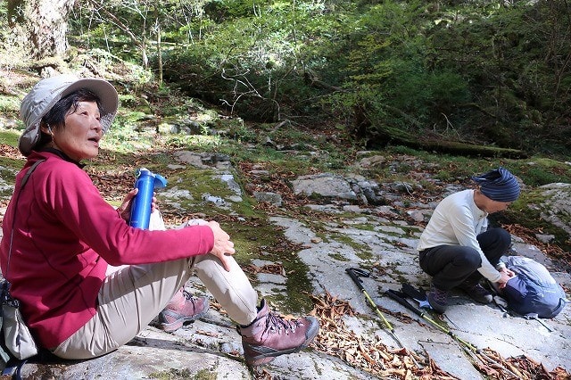 少し平らな場所で昼食にする。奥様たちは寝そべってスマホで滝の写真を撮っている。