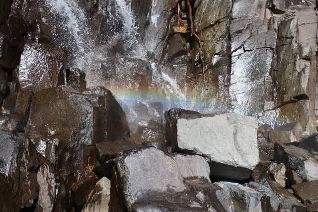 落差100mと言われる御来光の滝。ゴツゴツと角張った岩壁に流れ落ちる滝の水。