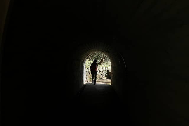 下部鉄道跡の下のトンネルを潜ると、社宅跡への道が続いている。