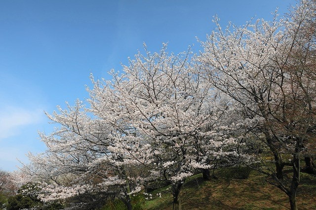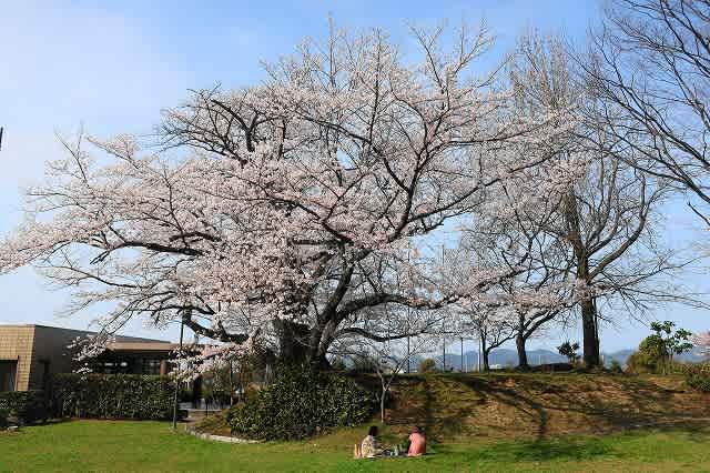 公園の駐車場の南側の斜面には満開の桜。その桜の花の下で敷物を広げて寛ぐ人々。