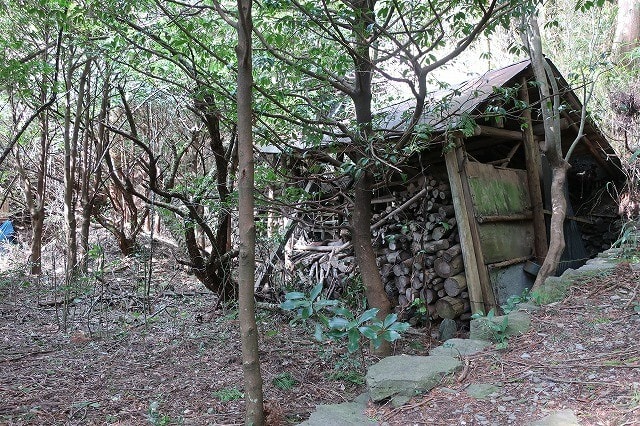 途中にあった薪を貯めた建屋。その奥には廃屋になった立派な民家があり、索道とは年代の違う