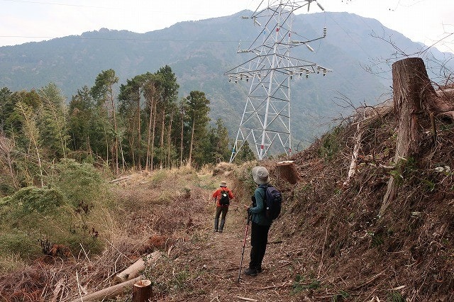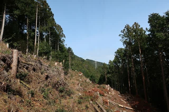 破線からは少し外れているが、保線路を下って行くと伐採地に出た。伐採地には電力の鉄塔と
