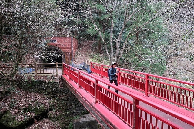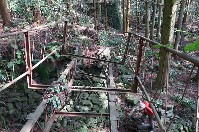 浴場跡から少し登って行くと、石段を跨ぐようにして鉄製の橋が架かっていた。