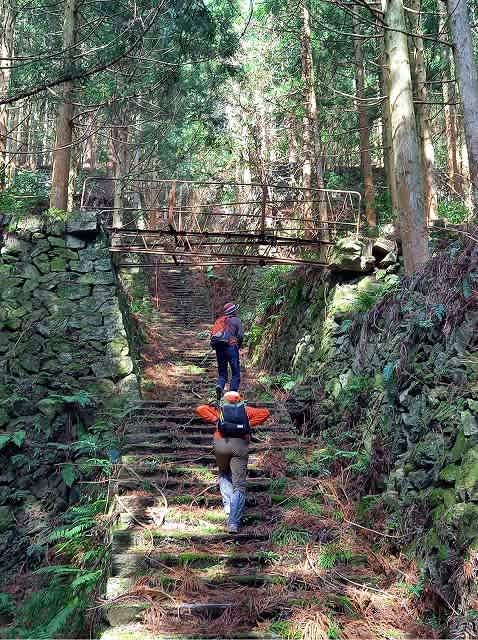 橋からもさらに石段は続いて行く。山歩きをしていて四国のみちの擬木階段や