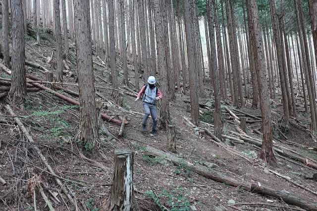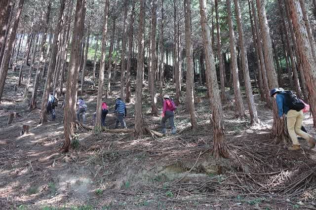 植栽地を下ると樹齢70年近くのスギとヒノキの林に出た。