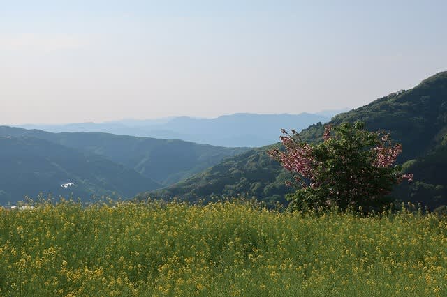 駐車場の脇に植えられている菜の花と八重桜はもう終わりを告げようとしていたが、