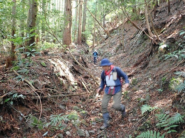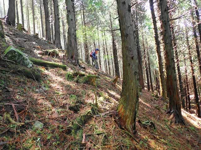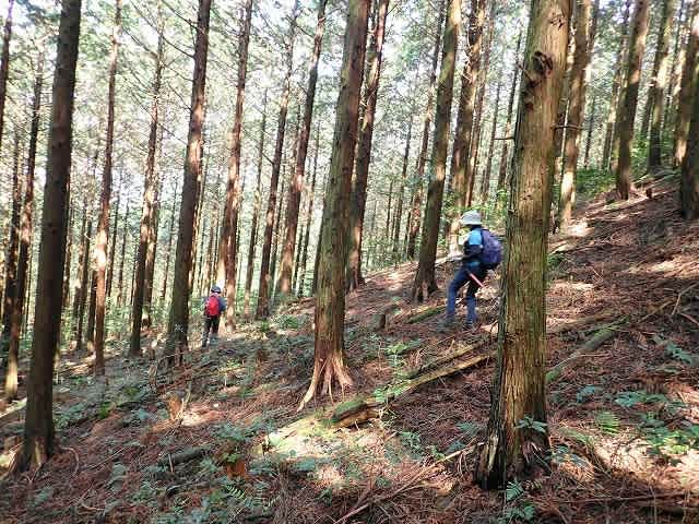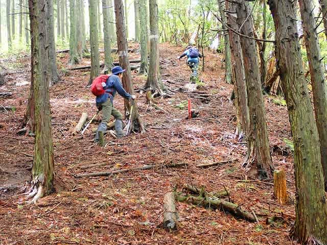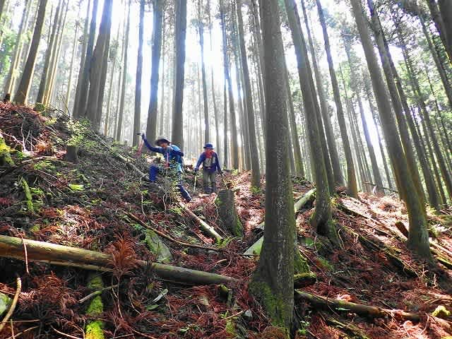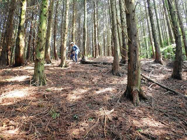 最初は緩やかだった斜面も次第に斜度を増してきたが、枝打ちで積もった枯れ枝と