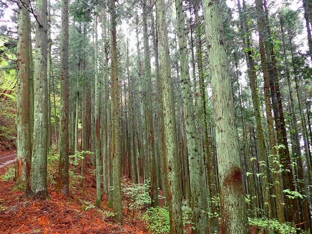 川の水の音が聞こえなくなると周りは杉林になり、足元は未舗装路になる。