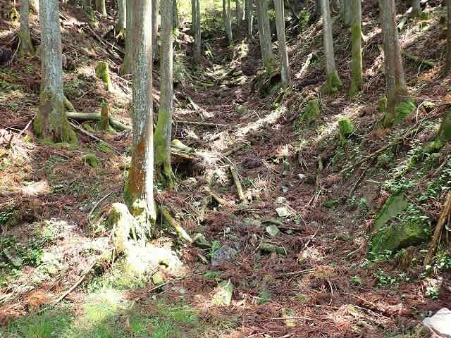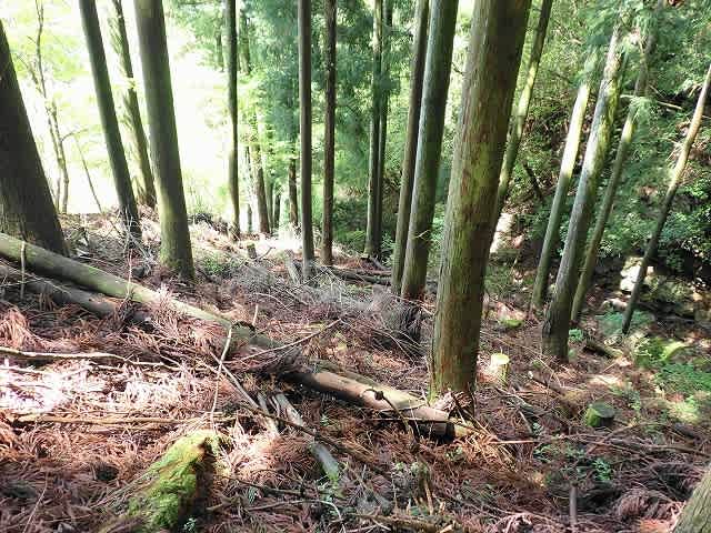 等高線に沿った横の作業道を何度か横断しながら下へ下へと下って行く。
