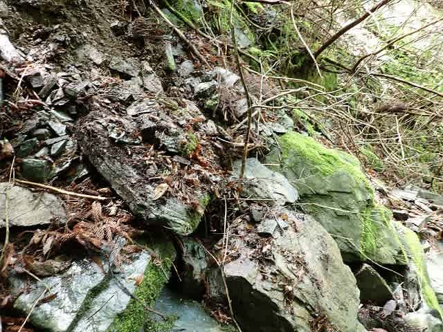 沢筋に降りて行くしかない状態になってきた。濡れた岩がゴロゴロする沢筋を