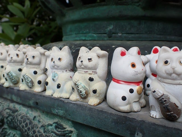 本殿から護摩堂・本坊の前を通って山門をくぐる。その途中には何故か招き猫が