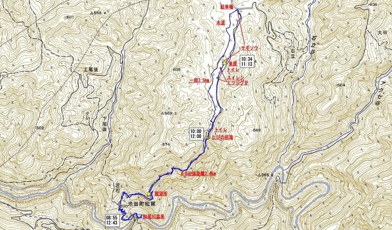 たびの尻滝からぐるっと一周してコーヒータイムも入れると、2時間弱かけて戻って来た。