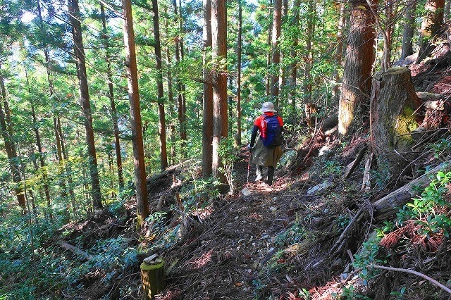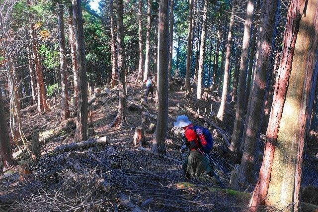 コースに軌道修正できると周りは次第に杉林の中になる。広い尾根では道を外しやすいが、