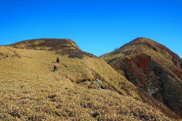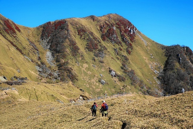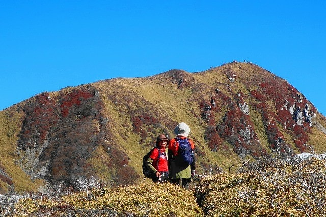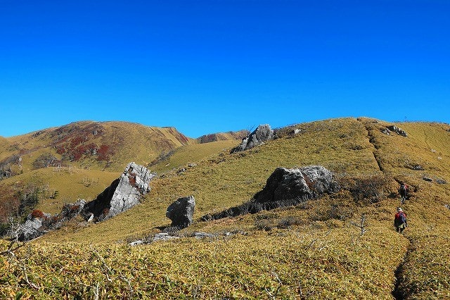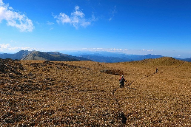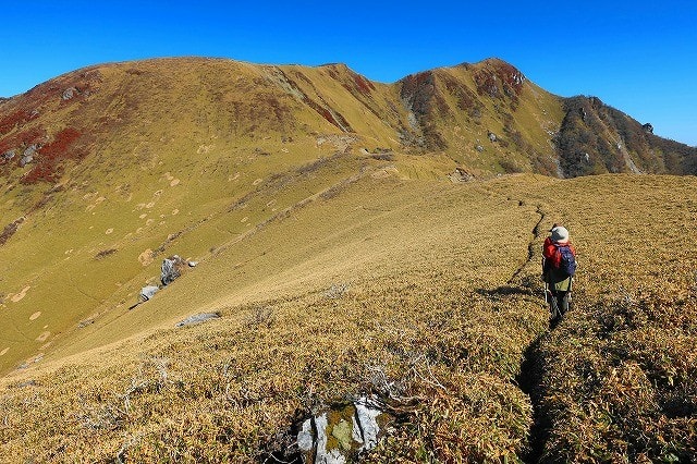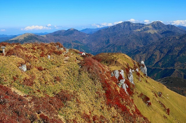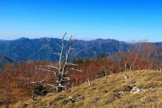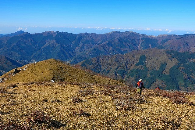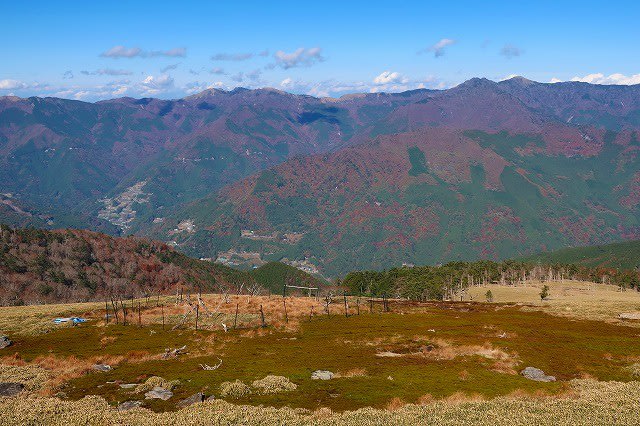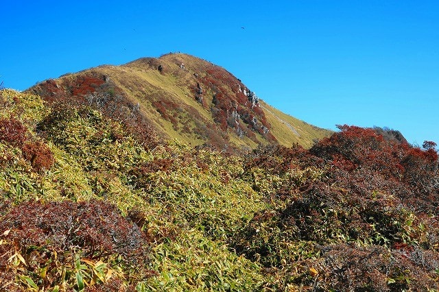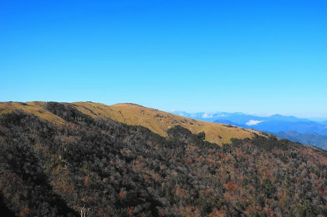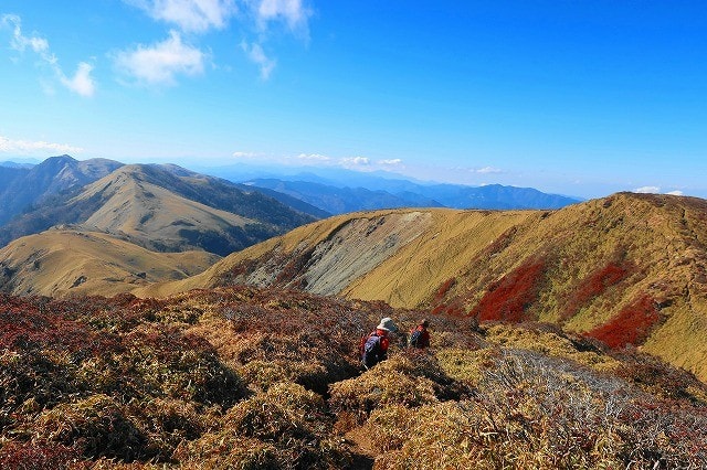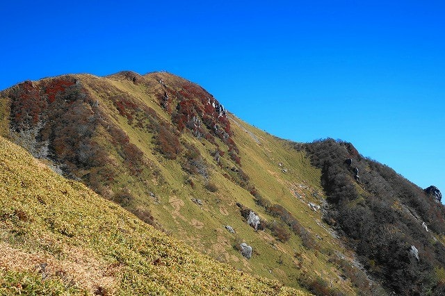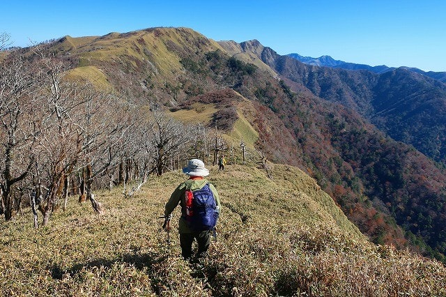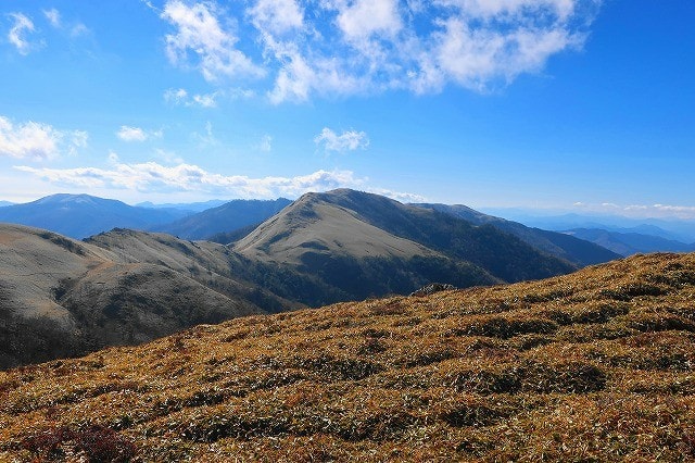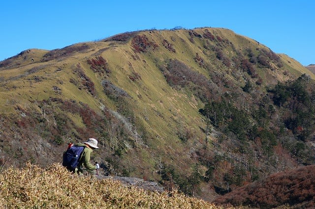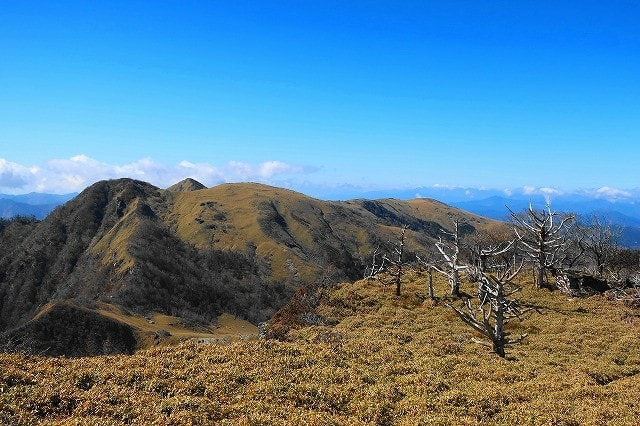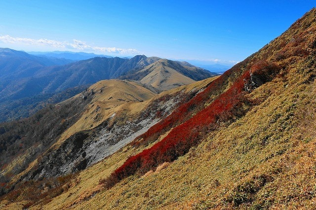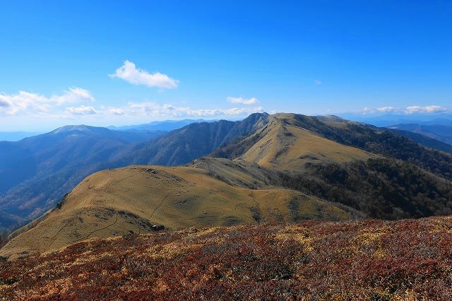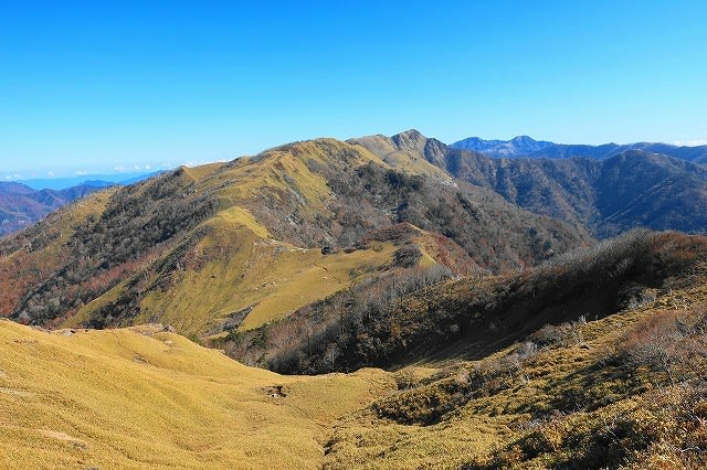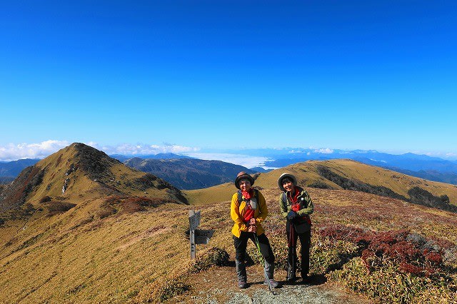 標高点の広尾根からはまだ色づきの残ったコメツツジをまとった三嶺。その山頂から